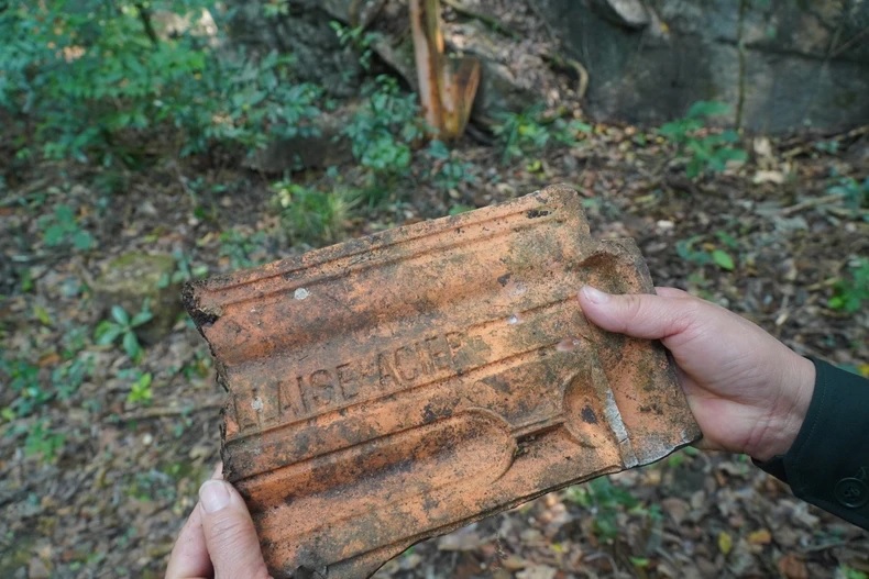 Một viên ngói vỡ của mái lợp hệ thống cáp tời quặng vẫn còn dòng chữ bằng tiếng Pháp sắc nét dù đã nằm lẫn trong cây cỏ hàng trăm năm. (Ảnh: Ngọc Tú).