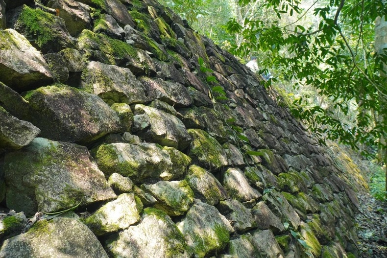 Một đoạn kè đường xếp đá nằm sâu trong rừng già vẫn sừng sững trước gió sương. (Ảnh: Ngọc Tú)