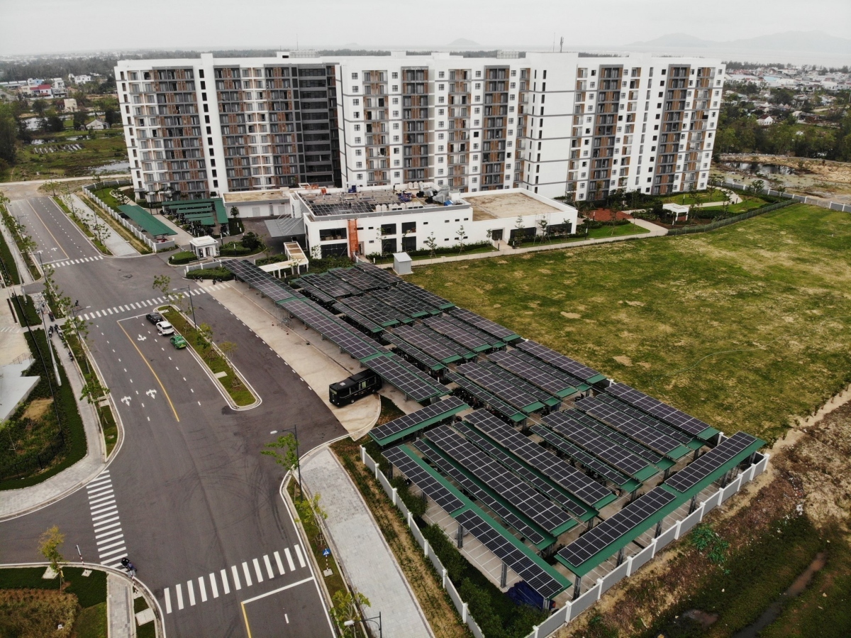 Một phần hệ thống điện năng lượng mặt trời của khu nghỉ Hoiana tại khu Làng nhân viên. Ảnh: Bảo Châu