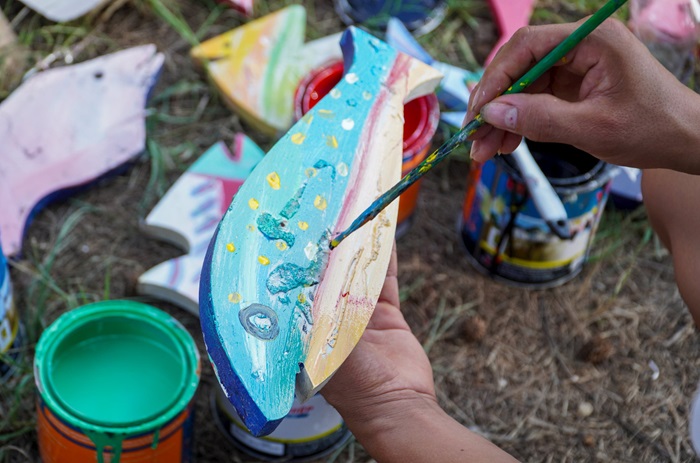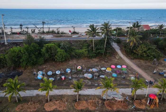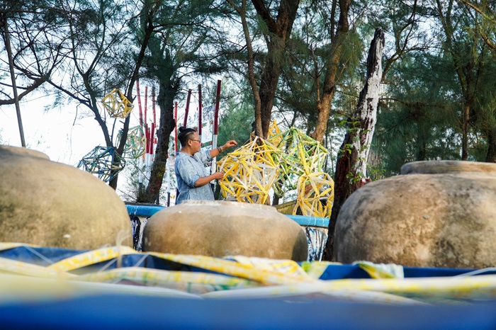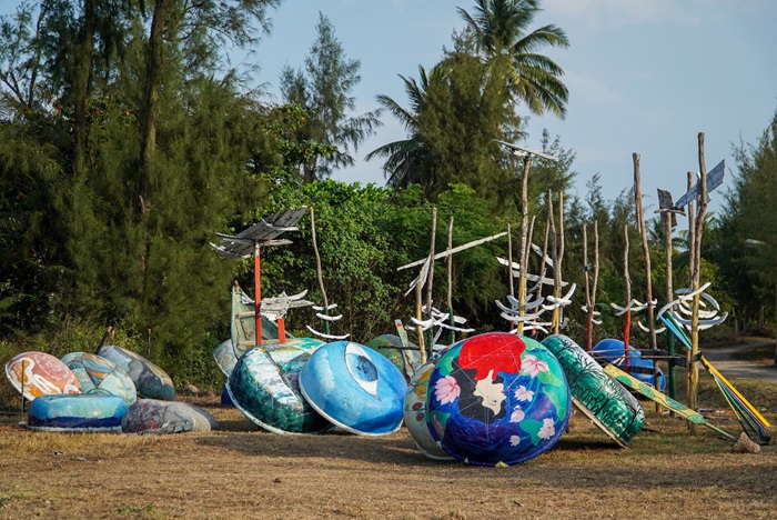 Những ngày này, đoạn đường ven biển qua thôn Hòa Thượng và Hòa Hạ (xã Tam Thanh, TP.Tam Kỳ) trở nên nhiều màu sắc và nhộn nhịp hẳn. Những chiếc chum, vại, thúng chai hay những chiếc máy chèo, mảnh thuyền vỡ… đang được các họa sĩ chế tác, làm mới và sắp xếp thành những bức tranh nghệ thuật. Nhiều vật dụng tưởng chừng như bỏ đi đã trở nên sống động, bắt mắt hơn, gắn với thông điệp bảo vệ môi trường, gìn giữ không gian làng biển.