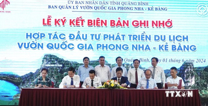 Ban Quản lý Vườn quốc gia Phong Nha - Kẻ Bàng và các doanh nghiệp ký và trao biên bản thỏa thuận hợp tác đầu tư phát triển du lịch. Ảnh: Võ Dung