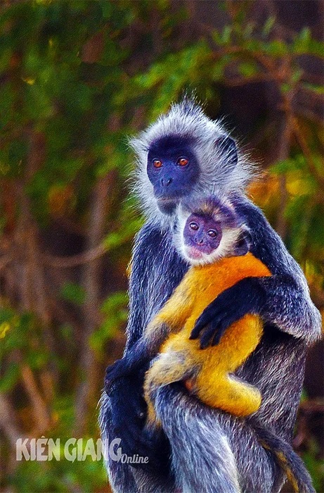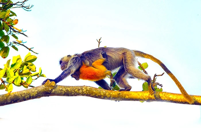 Voọc con thường bám mẹ nhiều hơn. Lúc nhỏ, chúng có màu vàng cam và chuyển thành màu xám khi được 3-4 tháng tuổi.