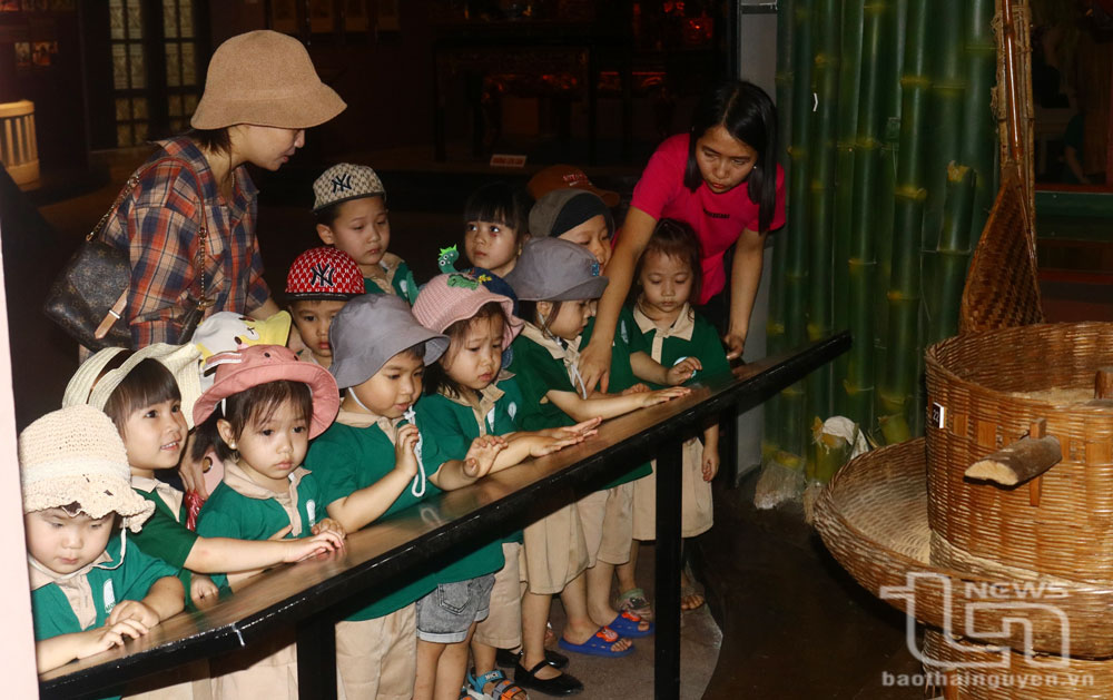 Các em nhỏ thích thú khi được tham quan hiện vật tại Bảo tàng Văn hóa các dân tộc Việt Nam.