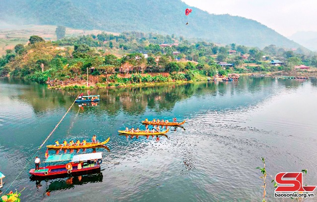 Giải đua thuyền truyền thống tại Hồ Suối Chiếu, xã Mường Thải, huyện Phù Yên. Ảnh: Huy Ngoan
