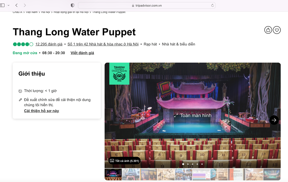 Nhà hát Múa rối Thăng Long được đánh giá cao trên trang web của Tripadvisor, nền tảng đánh giá du lịch toàn cầu
