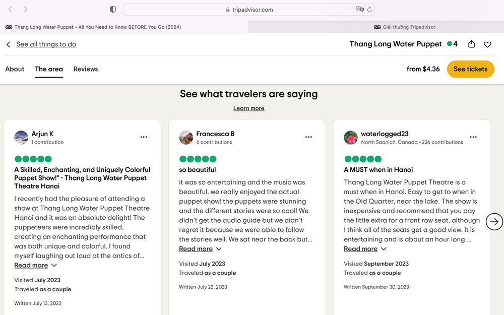 Du khách khắp thế giới đã đánh giá 5 sao cho Nhà hát Múa rối Thăng Long trên nền tảng đánh giá du lịch toàn cầu