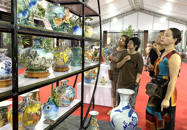 Du khách chiêm ngưỡng vẻ đẹp của sản phẩm gốm Bát Tràng (Gia Lâm, Hà Nội). Ảnh: VGP/Diệu Anh