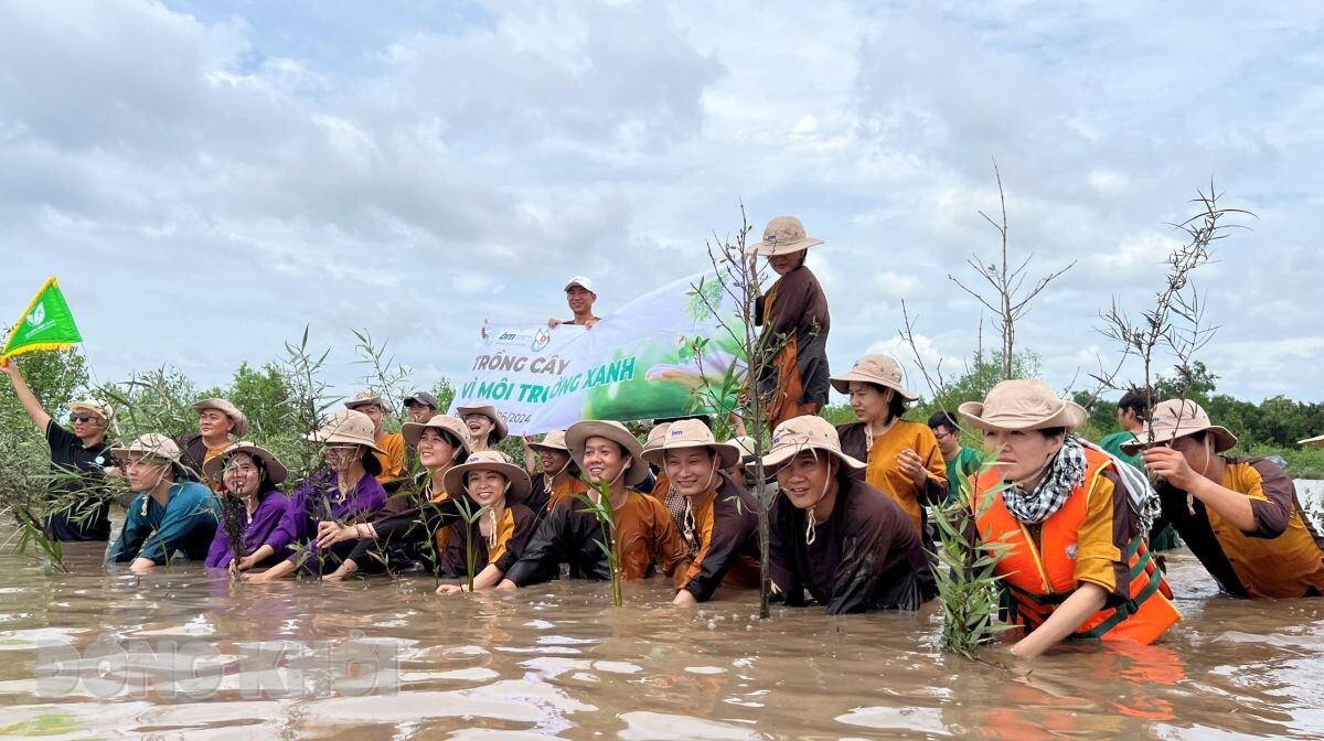 Khách du lịch trải nghiệm trồng rừng tại sông Ba Lai, xã Tân Mỹ, huyện Ba Tri, tỉnh Bến Tre
