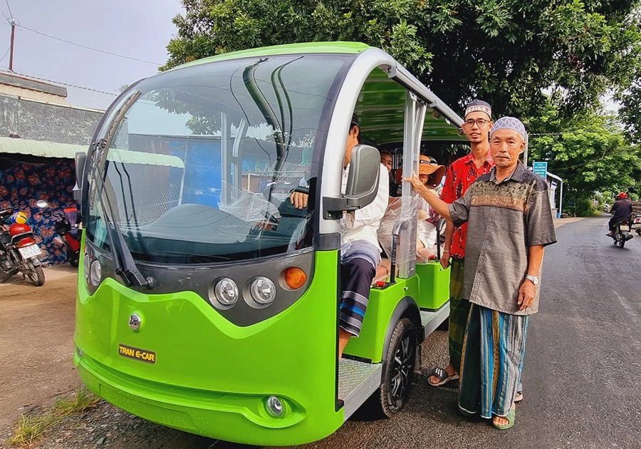 Xe điện đưa du khách tham quan làng Chăm Châu Phong.